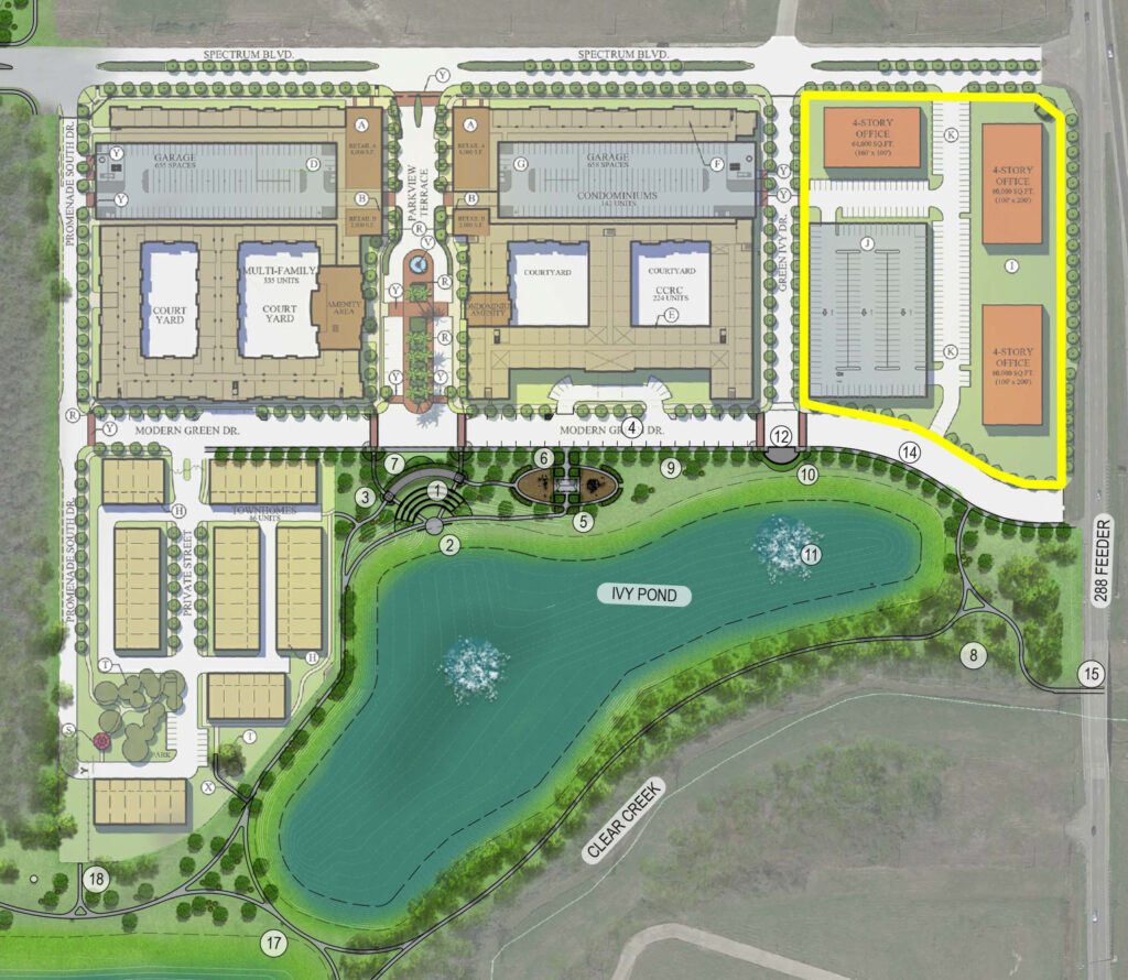 The Ivy at Lower Kirby, an America Modern Green Development (AMG), is located at the southeast corner of Lower Kirby, bounded by 288 to the east, Clear Creek to the south, and South Spectrum Blvd. to the north. The urban mixed-use development consists of approximately 48 acres and includes multi-family, condominiums, retail, and office uses. The development also includes gated townhomes and a public park adjacent to Clear Creek.